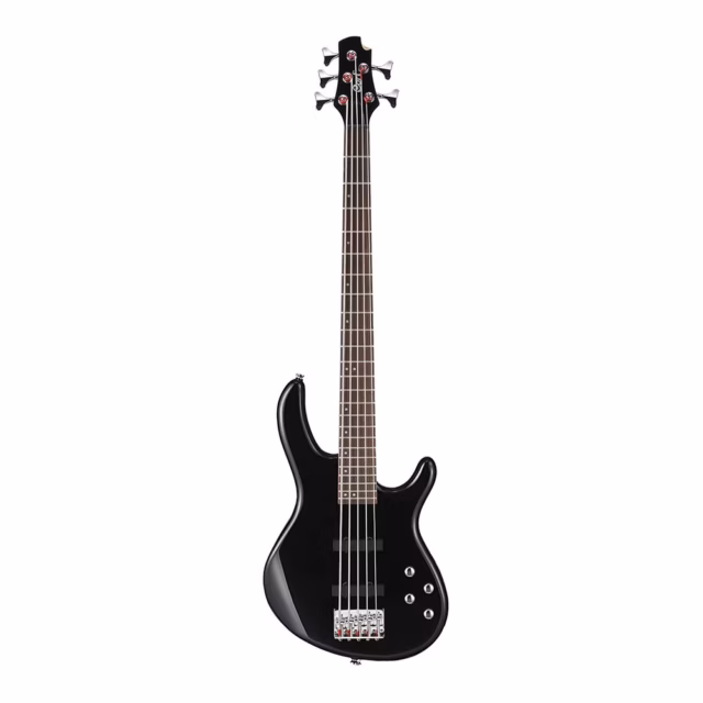 The Cort Action Bass V Plus BK 5-String Bass has a Poplar body, Hard Maple neck, and Jatoba fretboard.